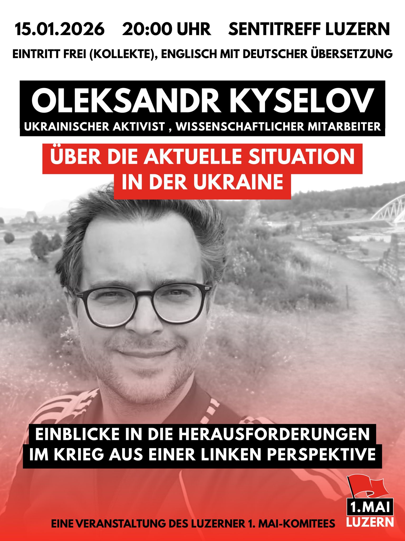 Eine Vorveranstaltung im Rahmen des 1. Mai 2026 in Luzern Oleksandr Kyselov stammt aus Donezk und ist Mitglied der sozialistischen Organisation “Sotsialnyi Rukh”. Er ist derzeit wissenschaftlicher Mitarbeiter am Institut für Politikwissenschaft der Universitat Uppsala.