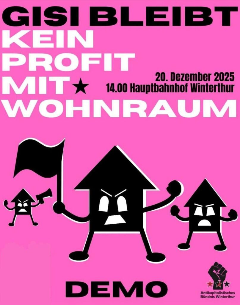 Gegen die Räumung der Gisi und den Erhalt von günstigem Wohnraum überall rufen wir euch alle auf, am Sa. 20.12.2025 um 14.00 Uhr an die grosse, vielfältige “Gisi bleibt! Kein Profit mit Wohnraum”-Demo zu kommen. Bringt Eure Freund:innen, Nachbar:innen, Arbeitskolleg:innen mit. Denn: Nur eine kleine Minderheit profitiert von der Wohnungsnot. Wir sind mehr!