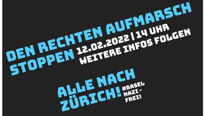Die antifaschistische Demo vom 12. Februar in Basel wird verschoben! Wir rufen alle dazu auf an diesem Tag gemeinsam nach Zürich zu fahren! Das ist eine Reaktion auf den Aufmarsch von organisierten Neonazis am 22. Januar in Bern. Dass Rechtsextreme als Spitze einer grossen Demonstration durch eine deutsch-schweizer Innenstadt laufen konnten, muss uns ein Alarmsignal sein: Verteidigen wir die Strassen gegen den rechten Vormarsch und brechen die Dynamik der Faschist*innen!