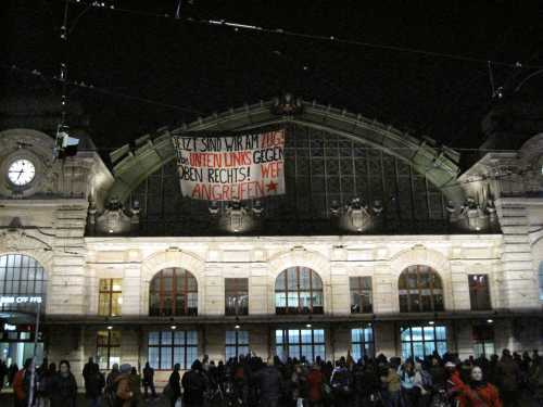 Anders für uns: In diesen Tagen bietet sich die Chance, unsere Inhalte und Perspektiven aufzuzeigen, sei es in Diskussionen am Anderen Davos, an der Demonstration in St. Gallen oder in zahlreichen nächtlichen Aktionen. Unsere Platzaktion, die am 27. Januar 2011 auf dem Bahnhofsplatz in Basel stattfand, reihen wir in diese Reihe vielfältiger Widerstandsformen ein. Ab 18 Uhr füllte sich der Platz mit Menschen, Musik, Parolen und Transparenten. Als Höhepunkt der Aktion wurde auf dem Dach des Bahnhofgebäudes ein grosses Transparent entrollt, das für Ausmerksamkeit bei den PassantInnen und Anwesenden sorgte: «Jetzt sind wir am Zug! Von unten links gegen oben rechts – WEF angreifen!»
