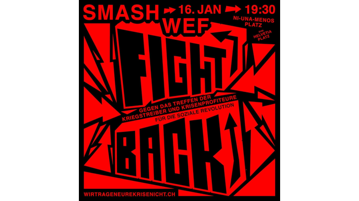 Das WEF und die Schweiz versuchen den Mächtigen dieser Welt – Kriegstreiber*innen und Kapitalist*innen – ein ruhiges Hinterland zu bieten. In diesem sollen sie sich ungestört austauschen und präsentieren können. Unser Widerstand richtet sich gegen diejenigen, die sich an Wirtschaftsgipfeln treffen, die globalen Krisen zu verantworten haben und von ihnen profitieren. Wir wollen die Ruhe in ihrem Hinterland stören und Sand ins Getriebe des kapitalistischen Systems streuen. Für eine solidarische Gesellschaft fern ab von Ausbeutung, Kriegen, Klimazerstörung und Unterdrückung müssen wir dieses System revolutionär überwinden und heute schon zeigen, dass wir die Machenschaften der Herrschenden nicht mehr dulden. Nutzen wir das Zusammenkommen der Mächtigen, um zu zeigen, dass wir ihre Macht und Ausbeutung nicht länger hinnehmen. Tragen wir den Widerstand gegen das WEF gemeinsam, laut und kämpferisch auf die Strassen!
