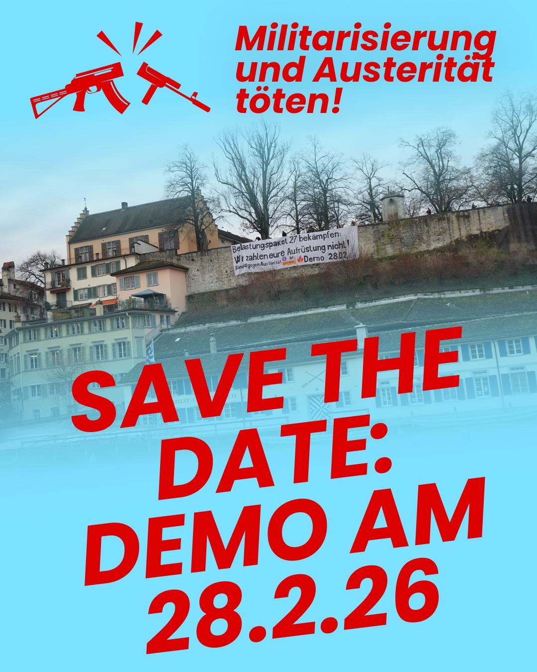 Während Milliarden in die Aufrüstung fliessen, werden Bildung, Gesundheit und soziale Sicherheit kaputtgespart. In der Schweiz sollen mit dem « Entlastungspaket 2027 » Kürzungen im Asylwesen, bei Bildung und Forschung, beim Opferschutz, beim Klimaschutz und zahlreichen weiteren Bereichen durchgeführt werden – zugunsten der Armee.