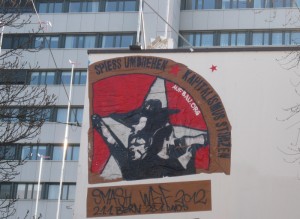 In Basel – wie schon am Samstag in Bern – war es einmal mehr nicht möglich, sich zu einem Aktionstag zu versammeln. Stellwände mit Informationsmaterial, Transparente, Büchsen für ein Wurfspiel, Fahnen und Essen wurden eingepackt und viele WEF-AktivistInnen verhaftet. Die Stadt ist einmal mehr von der Polizei besetzt. Während am WEF die Demokratisierungsbewegungen des arabischen Frühlings hochgelobt werden, wird die Demokratie hier mit Füssen getreten.