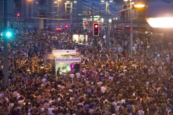 12 Wagen starteten auf dem Vorplatz der Reitschule und der Schützenmatte. Die riesige Menschenmenge setzte sich gegen 21:00 Uhr in Bewegung Richtung Bahnhofplatz. Die Strassen wurden komplett von Tanzenden in Beschlag genommen.