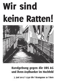 AG vom Kanton Bern den Auftrag in einer Zivilschutzanlage im Hochfeldquartier Asylsuchende unterzubringen. 160 Männer, Frauen und Kinder teilen sich sechs Räume mit je 27 Pritschen. Es besteht keine Kochgelegenheit und die Securitas patrouilliert ständig. Die ORS AG garantiert dem Kanton Bern die totale Loyalität gegenüber seiner Asylpolitik und erwirtschaftet sich private Profite. Unsere Leben sind mehr Wert als staatliche Fremdenhetze und Asylbusiness!