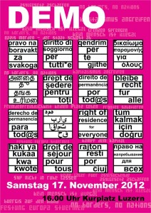 Wir fordern „Bleiberecht für alle“, im Gegensatz zu Abschottung und Repression. Jeder Mensch soll frei entscheiden können, wo er leben will auf diesem Planeten. Wir fordern also nicht nur „Bleiberecht für alle“ auf dem Territorium des schweizerischen Staates. Wir fordern „Bleiberecht für alle – überall!“ Erst die Abschaffung aller Grenzen und staatlichen Strukturen ermöglicht es jedem Menschen, sich an dem Ort seiner Wahl frei entfalten zu können. Die Zeit der Nationalstaaten mit ihren menschenverachtenden Grenzen und Gesetzen ist vorbei. Die Zeit der weltweiten Bewegungsfreiheit, der weltweiten Solidarität und der weltweiten Freiheit des Einzelnen ist gekommen!