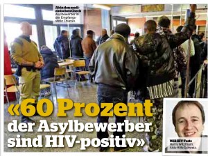 Leider bestätigte sich etwa zwei Wochen später, dass es der Zeitung nicht wirklich darum geht, die Aids-Prävention bei Asylsuchenden und die Unterstüzung im Krankeheitsfall zu thematisieren – an sich ja ein legitimes Thema. Im Artikel erklärt Harry Witzthum von der Aids-Hilfe Schweiz: „Mit Blick auf Personen aus Subsahara zeigen die epidemologischen Daten, dass sich über 60 Prozent der betroffenen Personen bereits in ihren Herkunftsländern mit HIV infiziert haben.“ Diese Aussage verwandelt sich nun aber wie durch ein Wunder in den Titel „60 Prozent der Asylbewerber sind HIV-positiv“!