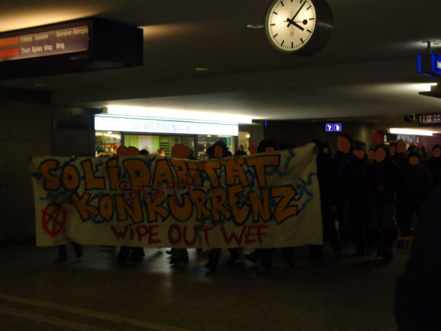 Begonnen haben die Aktionen im Bahnhof Bern, in der sogenannten “Rail City“. Wir hängten ein 40m2 grosses Transparent mit der Aufschrift: “Still not loving Capitalism”. Zudem wurden Flyer verteilt und mit Parolen beschriftete Konfetti herumgeworfen. Im 30 Minuten Takt gingen die Aktionen weiter: Als nächstes wurden in der Marktgasse zwei Stadtbrunnen symbolisch privatisiert und es wurde versucht, das Trinkwasser zu einem Marktpreis von 1.- pro Becher an die Schaulustigen zu verkaufen. Damit wurde auf die zunehmende Wasserprivatisierung von Firmen, wie beispielsweise Nestlé und CocaCola, aufmerksam gemacht. Die nächste Aktion fand im Migros in der Marktgasse statt, wo wir uns wie alle andern an der Kasse anstellten und für einmal bewegungslos verharrten. Als vierte und letzte Aktion besammelten wir uns auf dem Kornhausplatz, um mit einer kurzen, aber lautstarken Demo unseren Protest gegen die herrschenden Verhältnisse auf die Strasse zu tragen. Unter dem Motto “Solidarität statt Konkurrenz – Wipe out WEF” zog die Demo in die Marktgasse, wo sie sich selbstbestimmt auflöste. Später sammelte sich auf der Grossen Schanze eine spontane Nachdemo und zog lautstark durch den Bahnhof.
