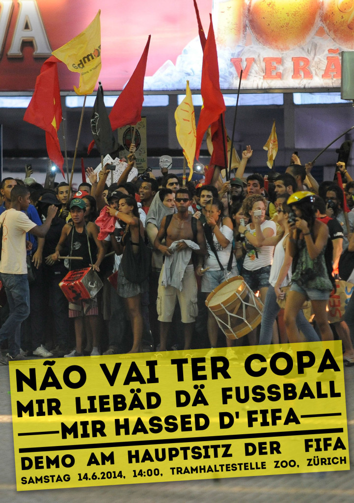 Um gegen solche und weitere soziale Probleme anzukämpfen, haben sich in Brasilien etliche revolutionäre Bündnisse und Komitees gegründet. Unter der gemeinsamen Parole “Não vai ter Copa” (Es wird keine WM stattfinden) kämpfen sie gegen die Missstände und Ursachen des kommerzialisierten Sportanlasses. Dabei wollen wir sie auch während der WM mit vielfältigen Aktionen unterstützen. Wie auch die AktivistInnen vor Ort wollen wir nicht den Fussball an sich kritisieren, sondern dessen kapitalistische Form. Was wir wollen ist eine Welt, in der sportliche Grossanlässe ohne Verdrängung, sexistische Werbestrategien, rassistische Stereotypen und Konsumlogik auskommen.