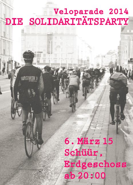 Zeig dich solidarisch gegenüber dem Velo, Velofahren, der Veloparade. Beste Erinnerungen an den 17. Mai 2014. Viele Leute, viele Velos, viel Lachen, Viel Freude. Vater Staat fand die Sache nicht freuderfüllt. Die Busse soll aufgeteilt werden. Komm in die Schüür und zeig dich solidarisch. Freier Eintritt, Unterhaltung, Tanzmusik, Spendekasse.