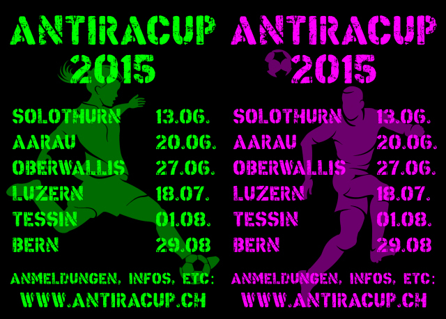 | Aufstehen, Anziehen, Raus gehen, Aufwärmen… schon bald geht es wieder los. Am 13. Juni startet die die Antira-Cup-Saison in Solothurn. Danach gehts weiter in Aarau, im Wallis, in Luzern, im Tessin, in Luzern und dann abschliessend in Bern. So gibt es sechs mal diesen Sommer die Gelegenheit zusammen zu kommen, zu diskutieren, was gemeinsam zu essen und trinken und natürlich zu Fussball spielen sowie ein Zeichen gegen Rassismus und andere Unterdrückungsstrukturen zu setzen.