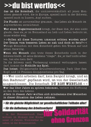 This entry was posted in Antira, Lagota, Luzern, Migration, Schweiz, Veranstaltungen and tagged Demo, Luzern, Regierungsgebäude, Solidarität, wertlos. Bookmark the permalink.