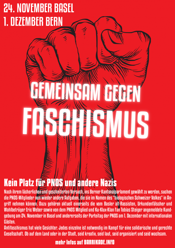 Dazu gehören aktuell einerseits die vom Basler alt-Rassisten, Urkundenfälscher und Wahlbetrüger Eric Weber sowie von dem PNOS Mitglied und Ku-Klux-Klan Fan Tobias Steiger angemeldete Kundgebung am 24. November in Basel und andererseits der Parteitag der PNOS am 1. Dezember mit internationalen Gästen.
