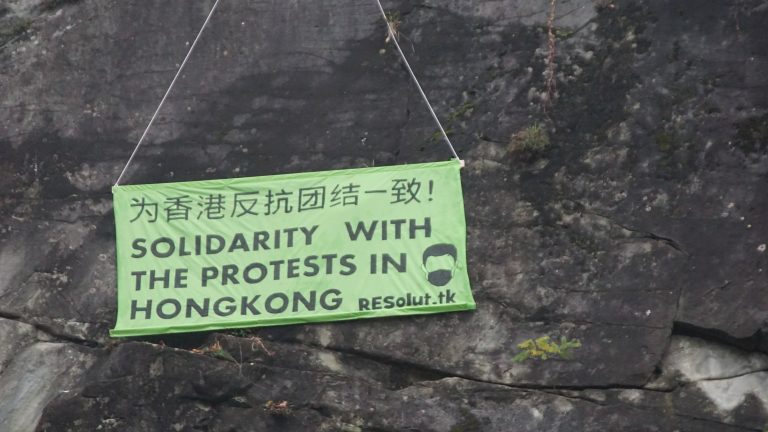 Am Sonntagmorgen haben mehrere Aktivist*innen der Gruppierung RESolut ein Banner mit der Aufschrift «Solidarity with the protests in Hongkong» in Chinesisch und Englisch beim Löwendenkmal in Luzern aufgehängt.