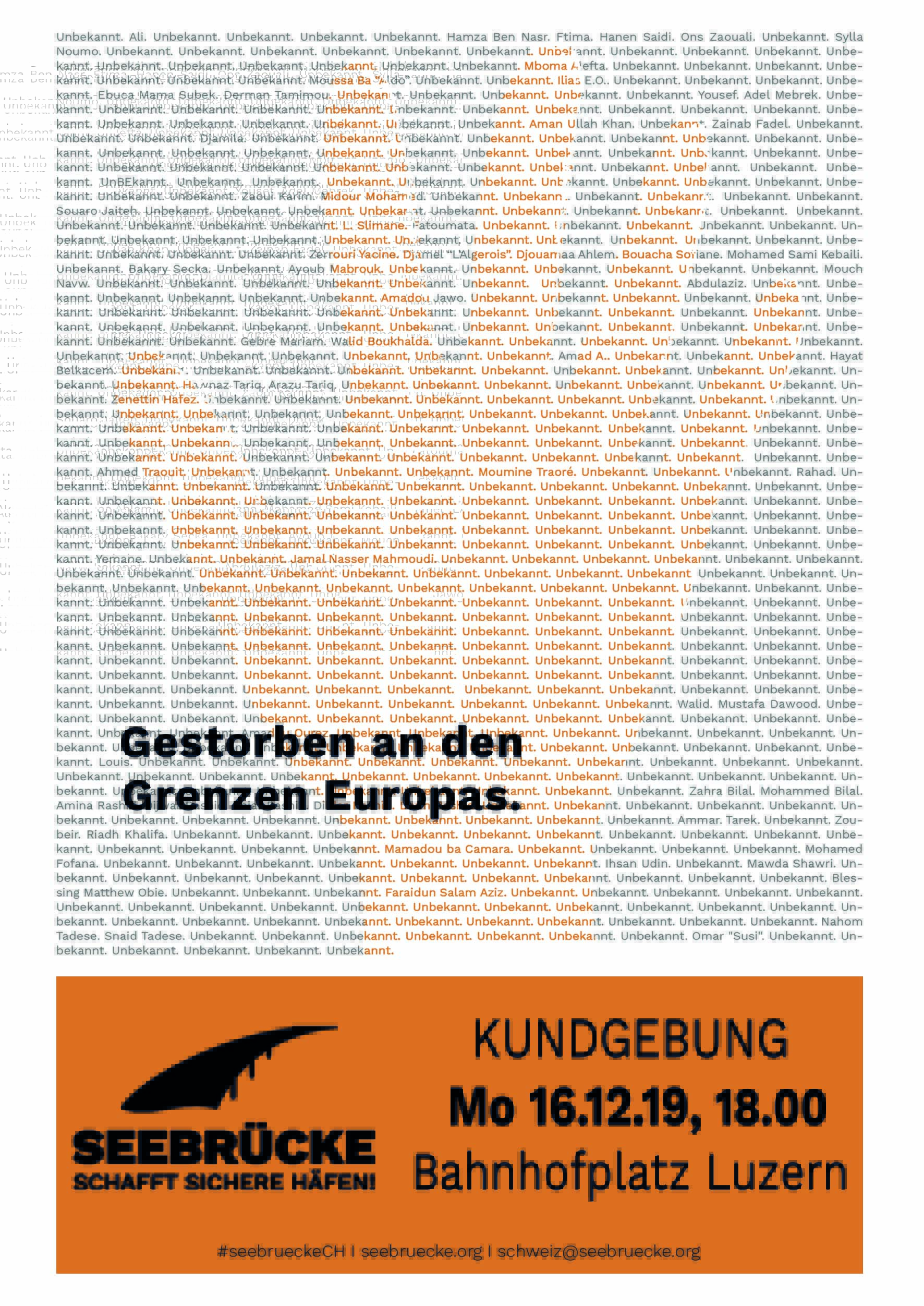 Anlässlich des Internationalen Tags der Menschenrechte führt die SEEBRÜCKE Schweiz auf dem Luzerner Bahnhofplatz am 16. Dezember 2019 ab 18.00 Uhr eine Gedenkkundgebung durch.