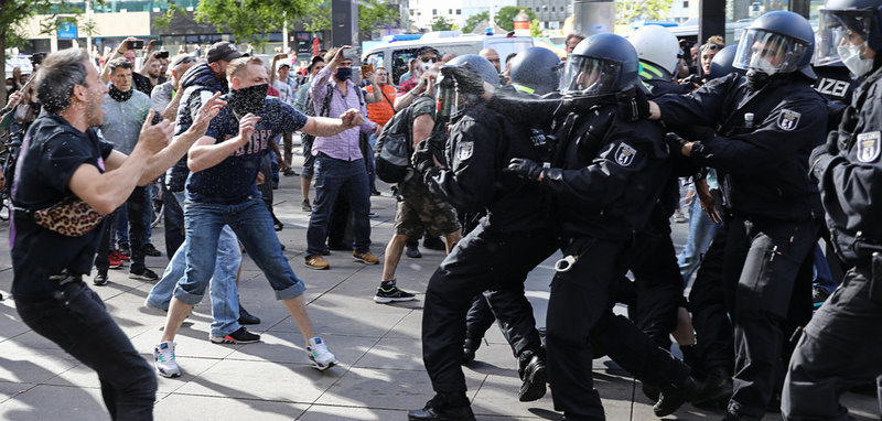 Quer durch Deutschland ist am Wochenende gegen die Beschränkungen im Zuge der Coronakrise demonstriert worden – wobei zahlreiche Teilnehmer die Auflagen missachteten und den Mindestabstand von 1,5 bis zwei Metern nicht einhielten. Auf dem Alexanderplatz in Berlin kam es nach Polizeiangaben zu gewalttätigen Auseinandersetzungen zwischen Demonstranten und Einsatzkräften. Rund 1.200 Personen hatten sich demnach zu der nicht angemeldeten Demonstration versammelt. Mehrere Teilnehmer skandierten Parolen wie »Wir sind das Volk« oder »Freiheit, Freiheit«. Ein im Internet kursierendes Video zeigt Hendrik Sodenkamp, einen der Initiatoren der Berliner »Hygienedemos«, der sich auf dem Platz, zunehmend verzweifelt, über die Beteiligung von extremen Rechten beschwert – und damit bei anderen Teilnehmern auf Unverständnis stößt: »Ich habe einfach nichts mit Nazis gemein«, sagt er und bekommt zu hören: »Wir sind alle ein Volk«, und: »Dann geh doch weg hier.« Laut Polizei kam es auch zu Flaschenwürfen und Angriffen auf Beamte. 86 Personen wurden vorübergehend festgenommen.