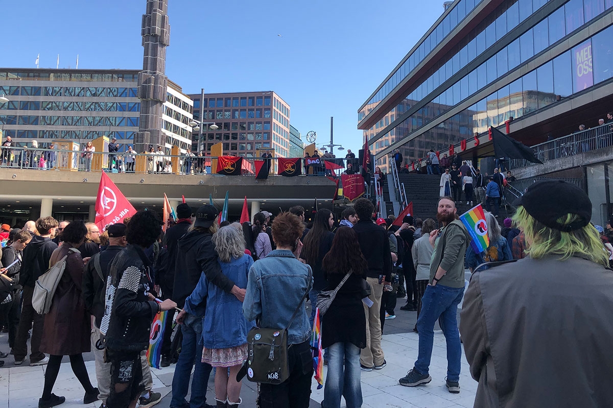 Stockholm. Der Auftaktort der syndikalistischen Demonstration zum 1. Mai in Stockholm bot einen für linksradikale Veranstaltungen ungewöhnlichen Anblick: Die Rednerinnen standen in einer mit schwarz-roten Fahnen geschmückten Betonkanzel. Diese war von der sozialdemokratischen Stadtregierung gebaut worden, damit der tiefer gelegene Vorplatz des Hauptbahnhofs zwischen Einkaufsstraße und der verkehrsberuhigten sechsspurigen Hauptstraße, die fast nur noch von Straßenbahnen, Radfahrern und Lieferfahrzeugen befahren wird, besser für Demonstrationen genutzt werden kann.