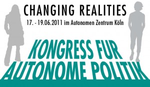 Gesellschaftliche Zustände verändern sich, wir verändern uns, und wir wollen gesellschaftliche Zustände verändern: Wir denken, dass es eines Abgleichs unserer persönlichen Lebensverhältnisse und unserer häufig als unzureichend empfundenen politischen Denkmuster und Auseinandersetzungsformen mit den sich rasant zuspitzenden Verhältnissen in der Welt bedarf. Woanders werden neue Ansätze von Widerspruch und Auflehnung spürbar, auf die wir häufig nicht angemessen zu reagieren in der Lage sind. Der Kongress für autonome Politik in Köln vom 17.-19.6.2011 macht sich auf die Suche nach mutmachenden Perspektiven zur Veränderung gesellschaftlicher Verhältnisse und versucht neue autonome Politikansätze anzudenken um unsere Handlungsspielräume zu erweitern – sendet uns Eure Beiträge!