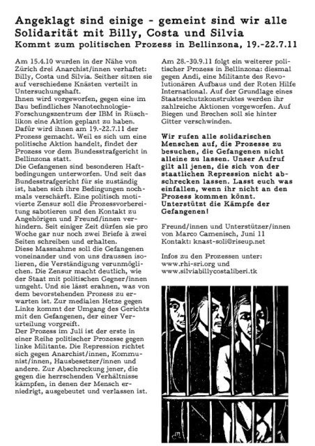 Dieses Repressionsmanöver richtet sich nicht nur gegen die drei Angeklagten, sondern gegen alle, die in der Ablehnung der bestehendenVerhältnisse eine dringende Notwendigkeit verspüren, die herrschende Ordnung umzustürzen und anzugreifen, gegen alle, die in der direkten Aktion einen entscheidenden Schritt im Kampf für die Freiheit und gegen die heutige Gesellschaftt sehen. Dasselbe Szenarium erlebten wir schon vor ein paar Jahren, als der Staat Marco Camenisch verfolgte, um ihn und die Anti-Atom Bewegung einzuschüchtern. Ein Schlag ins Leere, denn Marco hat trotz Gefangenschaft nie aufgegeben und kämpft mit revolutionärem und rebellischem Geist weiter!