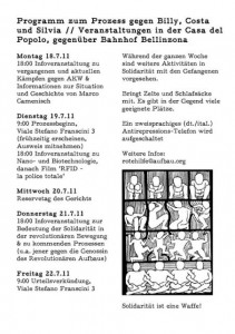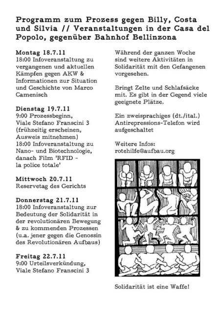 Für uns ist der Drang nach der Umwälzung des Bestehenden dieses gemeinsame Gefühl, das die Solidarität mit Billy, Costa und Silvia antreibt. Deshalb wollen wir zu einer Mobilisierung an den Prozesstagen aufrufen und bekräftigen, dass jeder Angriff gegen GefährtInnen ein Angriff gegen alle ist, die Leidenschaftlich für die Freiheit und gegen Staat und Kapital kämpfen.