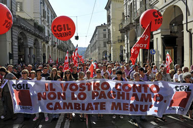 Auch in den Industriestädten Turin und Mailand gingen Zehntausende Menschen auf die Straßen. »Es handelt sich um die größte Demonstration in Turin in den letzten 15 Jahren«, sagte eine Gewerkschaftssprecherin in der Stadt des Autokonzerns Fiat. Während hier nach Angaben eines Unternehmenssprechers lediglich 25 Prozent der bei Fiat Beschäftigten die Arbeit niederlegten, bezifferte die Metallarbeitergewerkschaft FIOM die Streikbeteiligung in der industriereichen Region Lombardei auf 70 Prozent. In Mailand bewarfen Demonstranten die Sitze großer Banken mit Eiern. »Man will uns versklaven, aber wir rebellieren«, war auf einem Spruchband zu lesen.