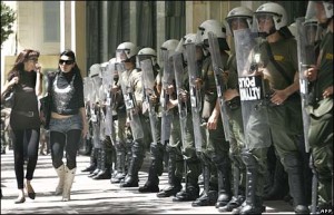 Pascalis – Der Staat spielt mit dem Gleichgewicht und versucht, den Schein einer Demokratie zu wahren. Denn wenn die Behörden versucht hätten, von allem Anfang der Besetzung mit Repression zu begegnen, dann wäre die Situation wohl eskaliert. Andererseits versucht der Staat ein gewisses Mass an Barrieren zu setzen. So wurde etwa am 29. Juni 2011, an dem Tag als über das Sparprogramm abgestimmt wurde, von den Behörden dazu aufgerufen, nicht in die Innenstadt zu kommen. Der Platz war zu diesem Zeitpunkt noch besetzt und dem Aufruf der Behörden wurde nicht Folge geleistet. So mussten die Abgeordneten, um abstimmen zu können, unter Polizeischutz in das Parlamentsgebäude. Das hatte eine massive Symbolkraft.