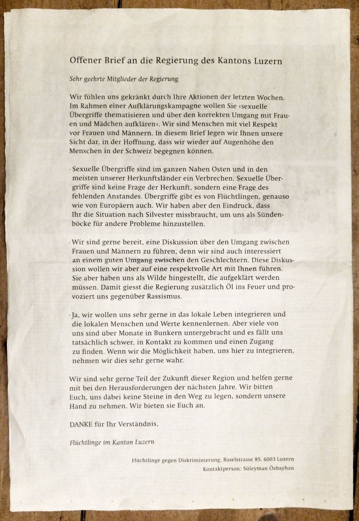 Wir fühlen uns gekränkt durch Ihre Aktionen der letzten Wochen. Im Rahmen einer Aufklärungskampagne wollen Sie «sexuelle Übergriffe thematisieren und über den korrekten Umgang mit Frauen und Mädchen aufklären». Wir sind Menschen mit viel Respekt vor Frauen und Männern. In diesem Brief legen wir Ihnen unsere Sicht dar, in der Hoffnung, dass wir wieder auf Augenhöhe den Menschen in der Schweiz begegnen können. Continue reading